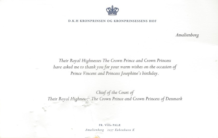 Royal response from Their Royal Highness The Crown Prince and Crown Princess of Denmark on the occasion of their children’s birthday, Their Royal Highnesses Prince Vincent and Princess Josephine’s 8th Birthday.