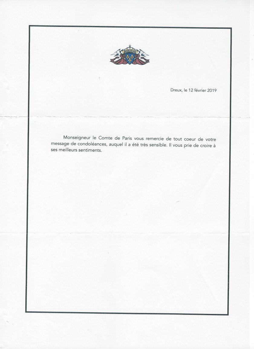 Monseigneur le Comte de Paris thank you wholeheartedly for your message of condolences, to which he was very sensitive. He begs you to believe his best feelings.