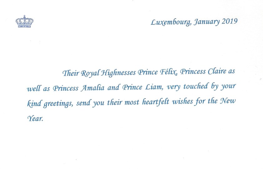Royal response from Their Royal Highnesses Prince Félix, Princess Claire, Princess Amalia and Prince Liam for Christmas.