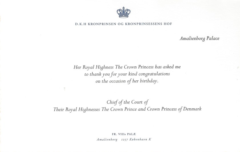 Crown Princess Mary’s Birthday 27th February 2019 royalresponses Royal Responses 2 comments Royal response from Her Royal Highness The Crown Princess of Denmark on the occasion of her birthday. Card Share this: Click to share on X (Opens in new window) X Click to share on Facebook (Opens in new window) Facebook More Click to share on Tumblr (Opens in new window) Tumblr Click to share on WhatsApp (Opens in new window) WhatsApp Click to email a link to a friend (Opens in new window) Email Like Loading... Related