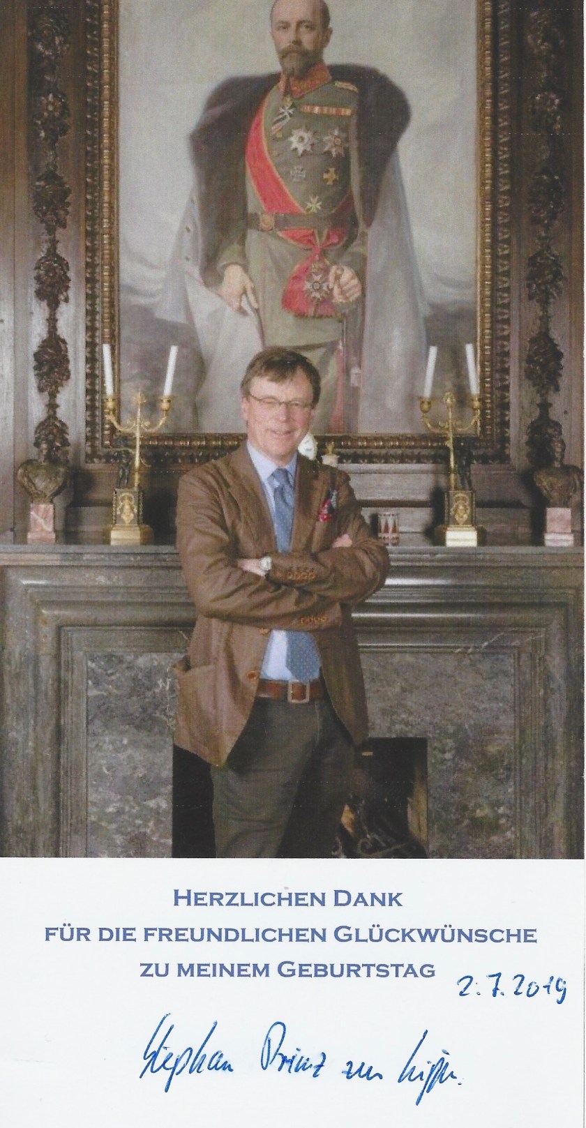 Royal response from His Royal Highness Stephan, Prince de Lippe on the occasion of his 60th birthday. The response is the form of a picture featuring a message thanking me in German and signed by the Prince himself.