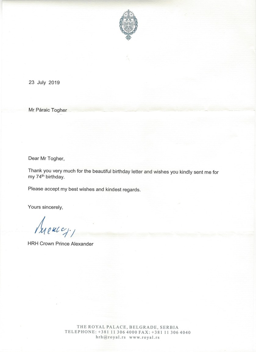 Royal response from His Royal Highness The Crown Prince of Serbia on the occasion of his 74th birthday.