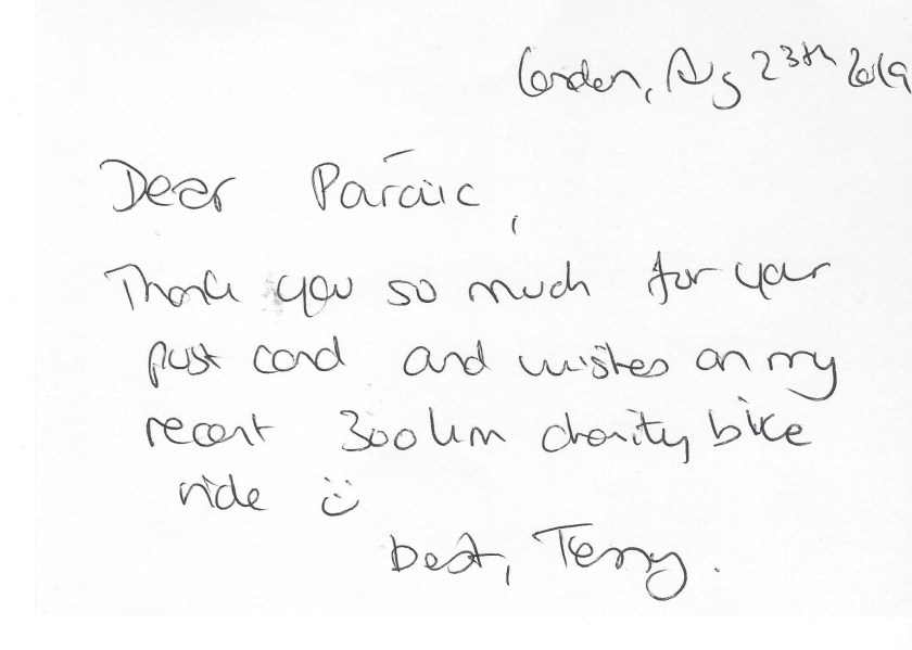 Royal response from Ms Tessy Antony-de Nassau in response to a postcard I sent her as well as a letter I wrote for her completion of her 300km cycle that she did for Professors without Borders. The message is handwritten by Tessy.
