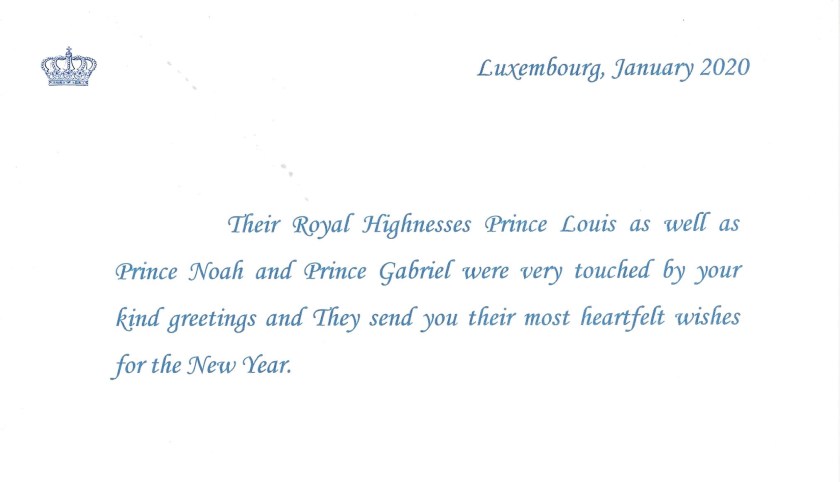 Royal response from His Royal Highness Prince Louis of Luxembourg and his children Prince Gabriel and Prince Noah of Luxembourg for Christmas 2019. The reply is in the form of a card thanking me for my seasons greetings and wishing me a Happy New Year.