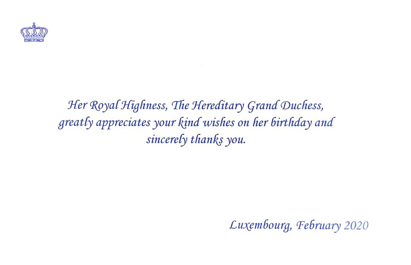 Royal response from Her Royal Highness The Hereditary Grand Duchess of Luxembourg on the occasion of her 36th birthday. Her Royal Highness is the husband of His Royal Highness The Hereditary Grand Duke of Luxembourg and will one day be Grand Duchess of Luxembourg. Her Royal Highness was born 18th February 1984 in Ronse, West Flanders, Belgium, her parents were Count Philippe de Lannoy and Countess Alix de Lannoy ne della Faille de Leverghem, she is the youngest child and forth daughter of the couples eight children.