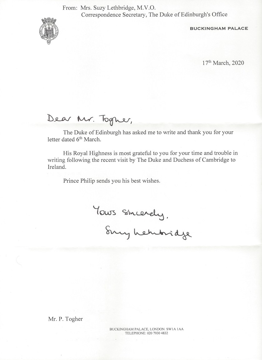 Royal response from His Royal Highness The Duke of Edinburgh in response to a letter I wrote in regards to the recent tour of Their Royal Highnesses The Duke and Duchess of Cambridge to Ireland March 3rd – 5th.