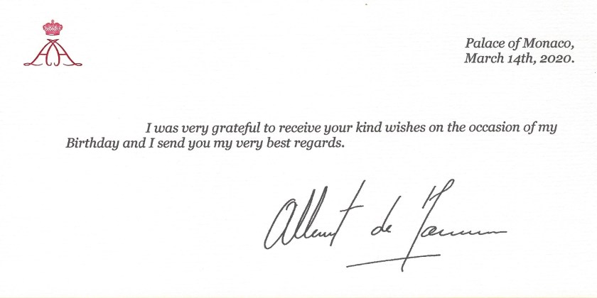 Royal response from His Serene Highness The Prince of Monaco on the occasion of his 62nd birthday. The reply features His Serene Highnesses official royal Monogram, the date of his birthday and is signed using auto-pen or a printed signature of His Serene Highness.