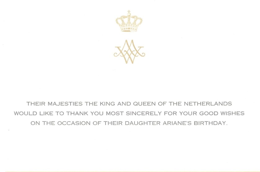 The reply is in the form of a card thanking me for my good wishes on Princess Ariane’s birthday and also features the duel Cypher of Their Majesties with the Crown of the Netherlands over it.