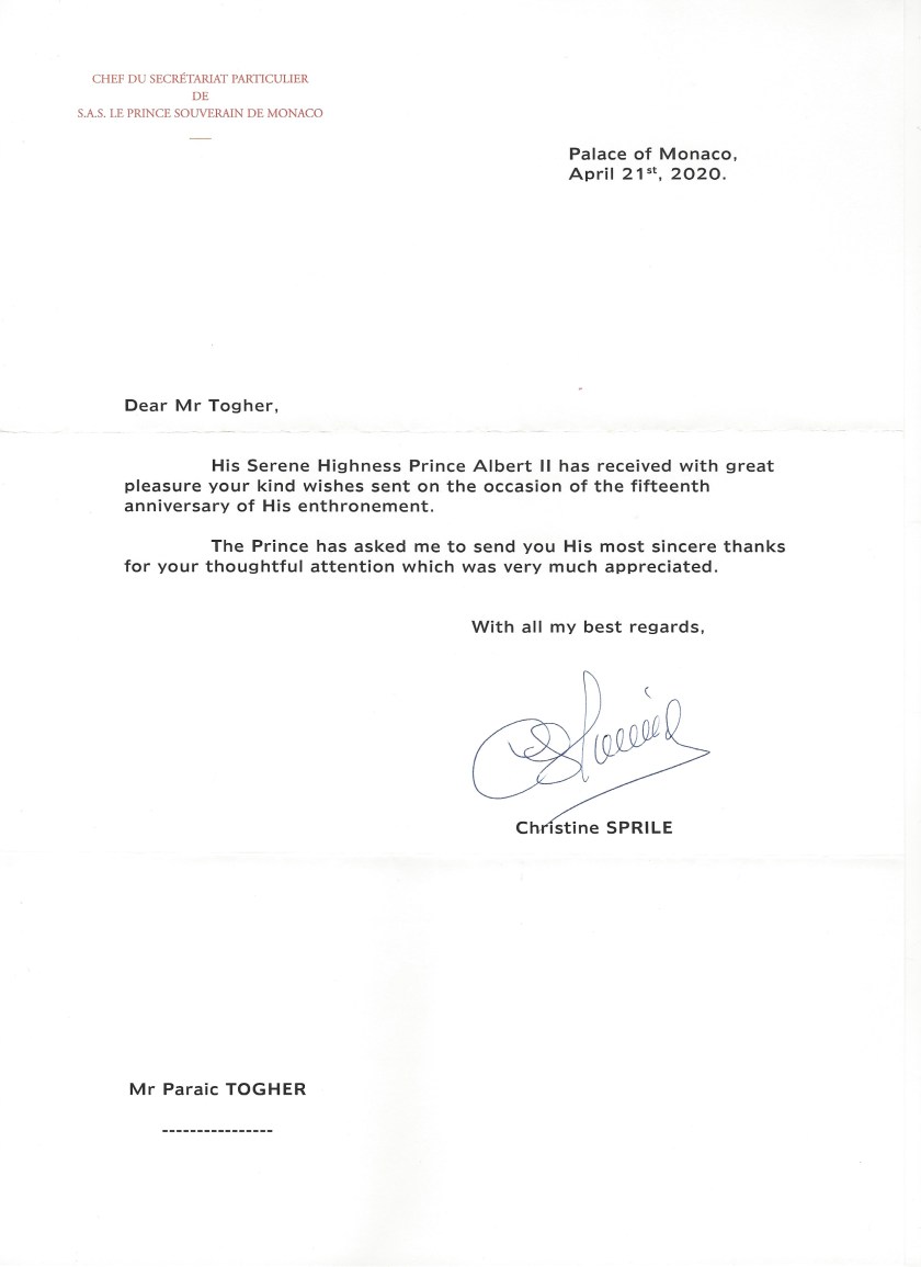 Royal response from His Serene Highness The Prince of Monaco on the 15th anniversary of his accession to The Throne of Monaco.