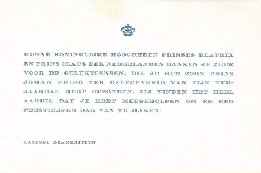 Their Royal Highnesses Princess Beatrix and Prince Claus of the Netherlands thank you very much for the congratulations that you sent their son Prince Johan Friso on the occasion of his birthday. They are very pleased that you have helped to make it a festive day.