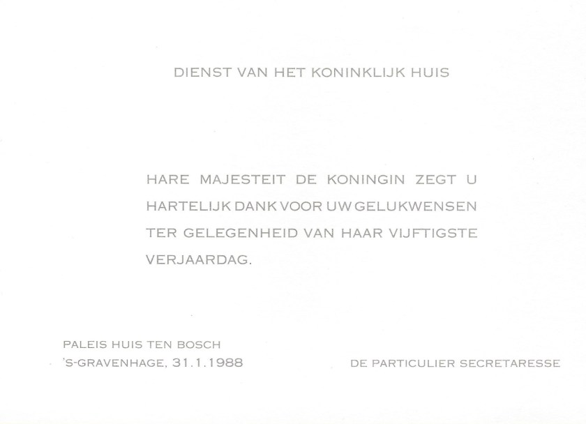 Royal response from Her Majesty The Queen of the Netherlands on the occasion of her 50th birthday.