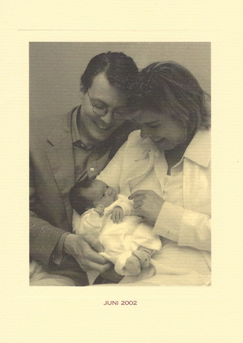 The reply is in the form of a card with a picture of the new parents with their newborn daughter and inside is a message in Dutch.