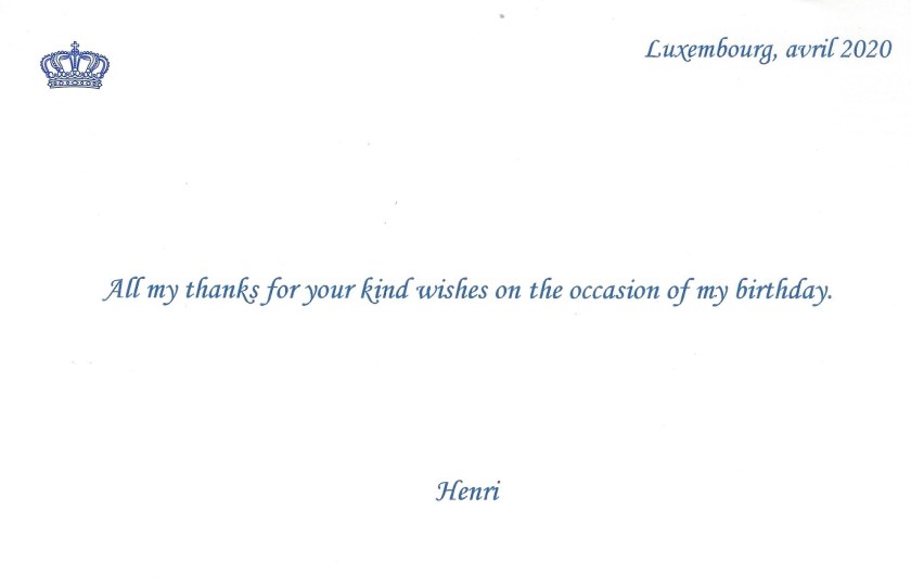 Royal response from His Royal Highness The Grand Duke of Luxembourg on the occasion of his 65th Birthday.