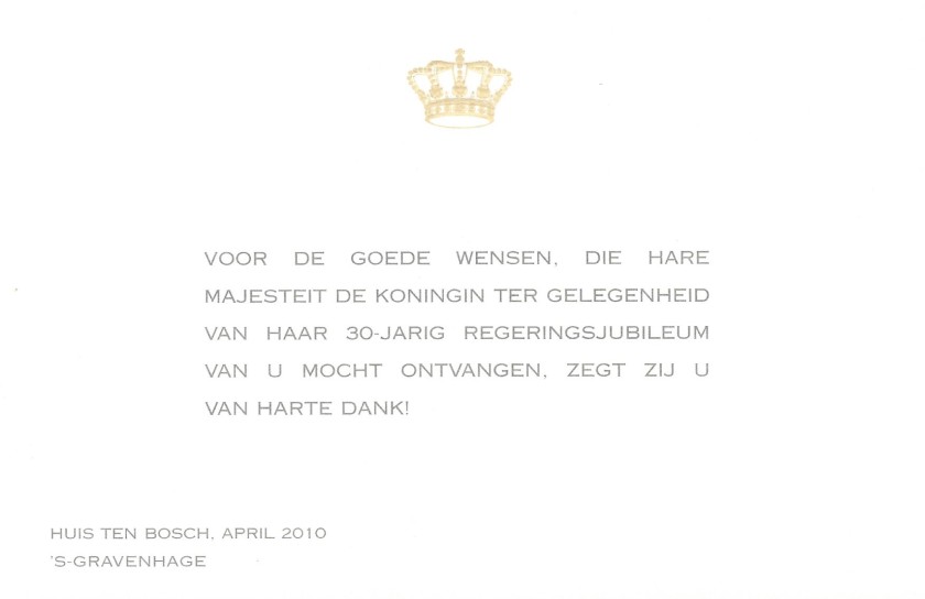 Royal response from The Queen of the Netherlands on the occasion of the 30th anniversary of her accession to the Throne of the Netherlands.