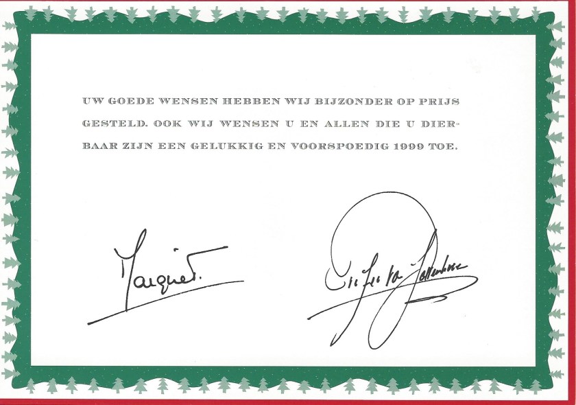 Royal response from Her Royal Highness Princess Margriet of the Netherlands and Peter van Vollenhoven Jr. on the occasion of Christmas 1998 and the New Year 1999.