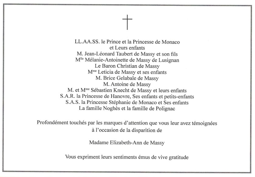 Royal response from The Princely Family of Monaco and The de Massy family on the passing of Madame Elizabeth-Ann de Massy.