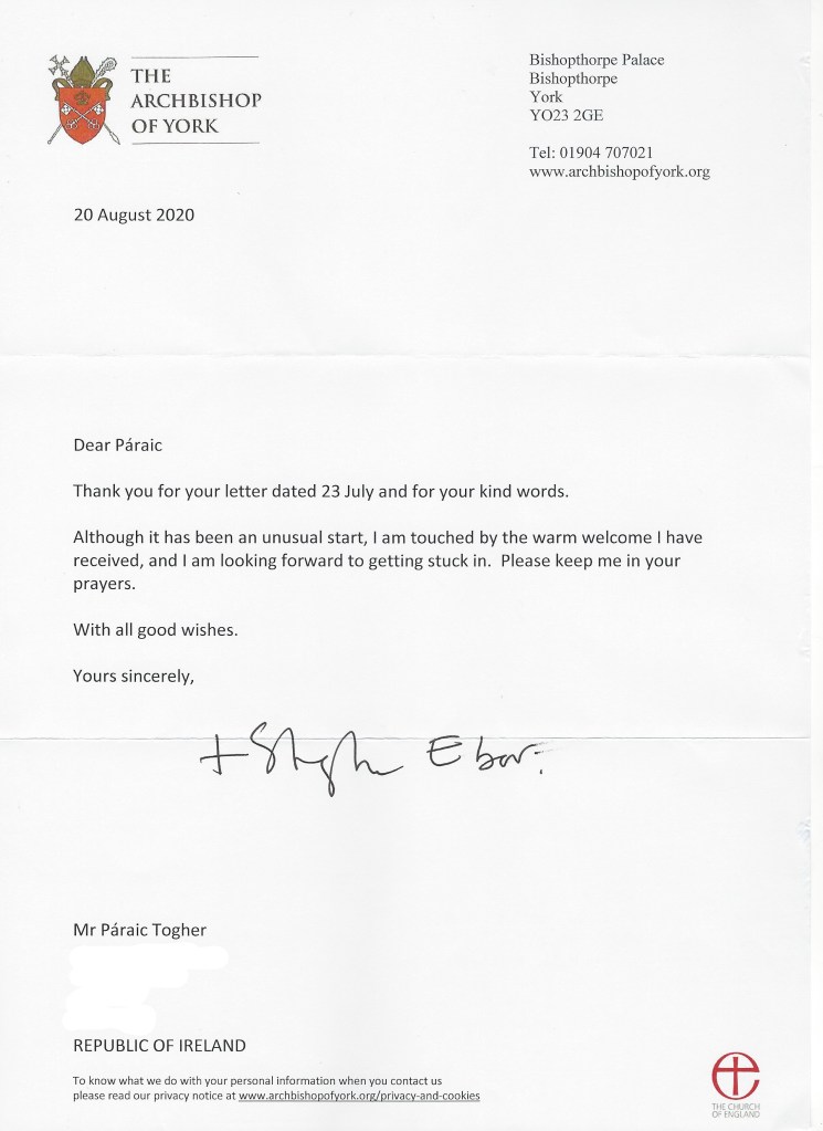 The reply is in the form of a letter thanking me for my letter and my congratulations on his appointment as The Archbishop of York.