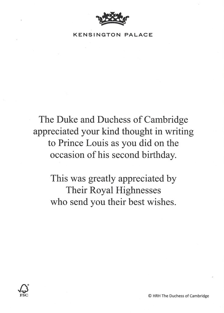 Royal response from Their Royal Highnesses The Duke and Duchess of Cambridge on the occasion of their son His Royal Highness Prince Louis of Cambridge’s 2nd birthday.