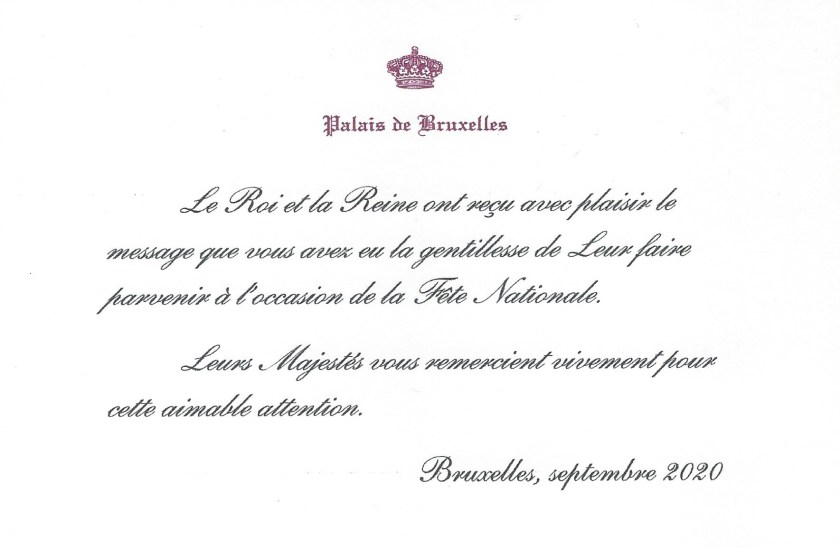Royal response from Their Majesties The King and Queen of The Belgians on the occasion of national day 2020.