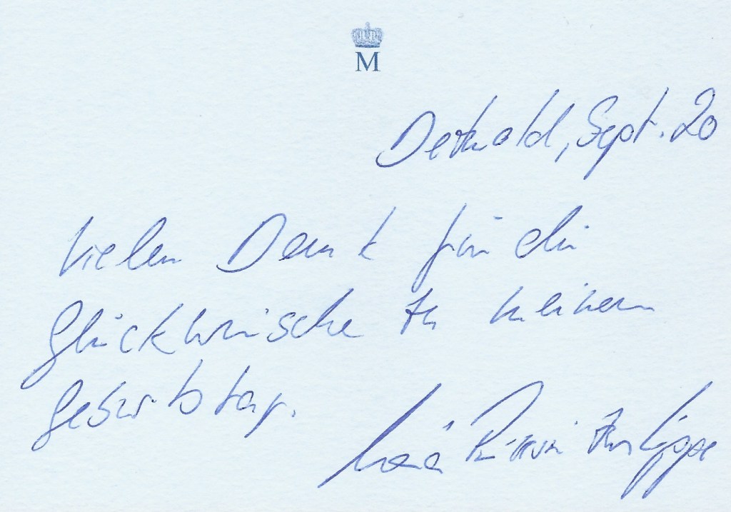 The reply is in the form of a card written in German with Her Serene Highnesses Monogram on top.