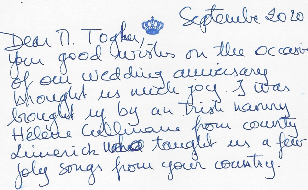 The reply is in the form of a handwritten card in English and signed by Her Royal Highness Princess Sibilla of Luxembourg and also included was a family portrait which features Their Royal Highnesses with their four children Their Royal Highnesses Prince Paul Louis, Prince Léopold, Princess Charlotte and Prince Jean of Nassau.