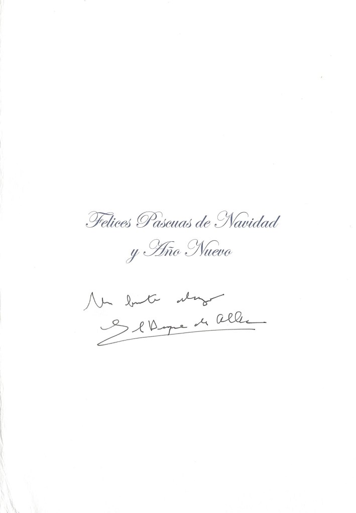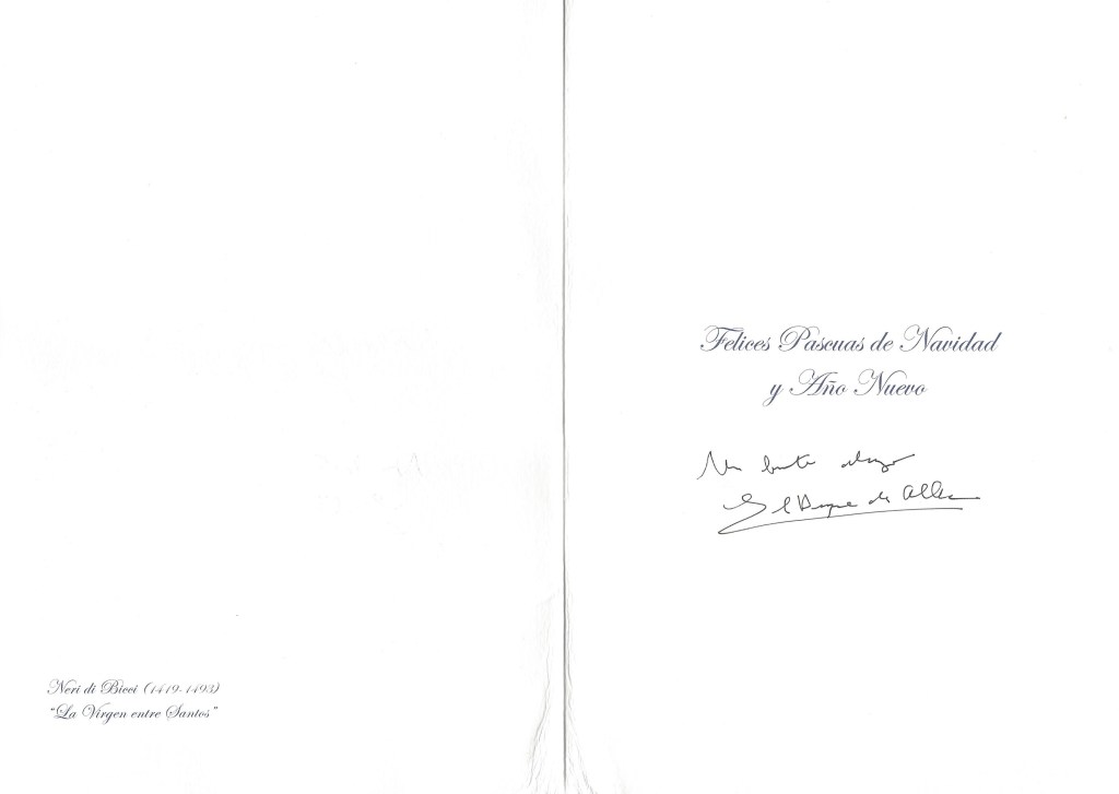 The reply is in the form of a card which on the front is a portrait “La Virgen entre Santos” by Neri di Bicci (1419 – 1493) and inside is a message in Spanish and it is hand signed by The Duke.