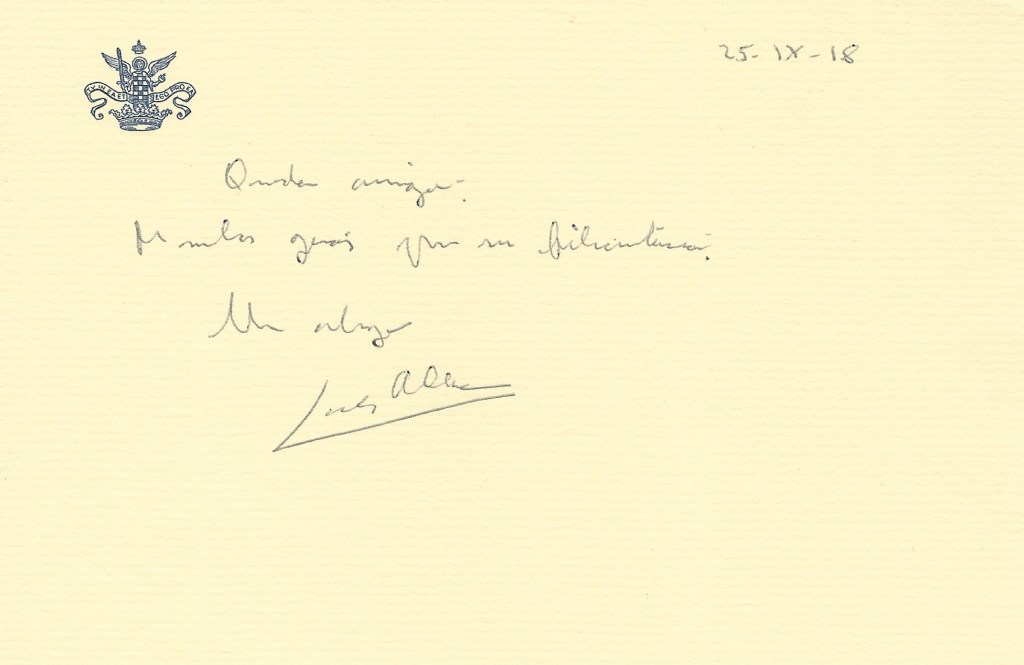 The reply is in the form of a handwritten card from The Duke of Alba.