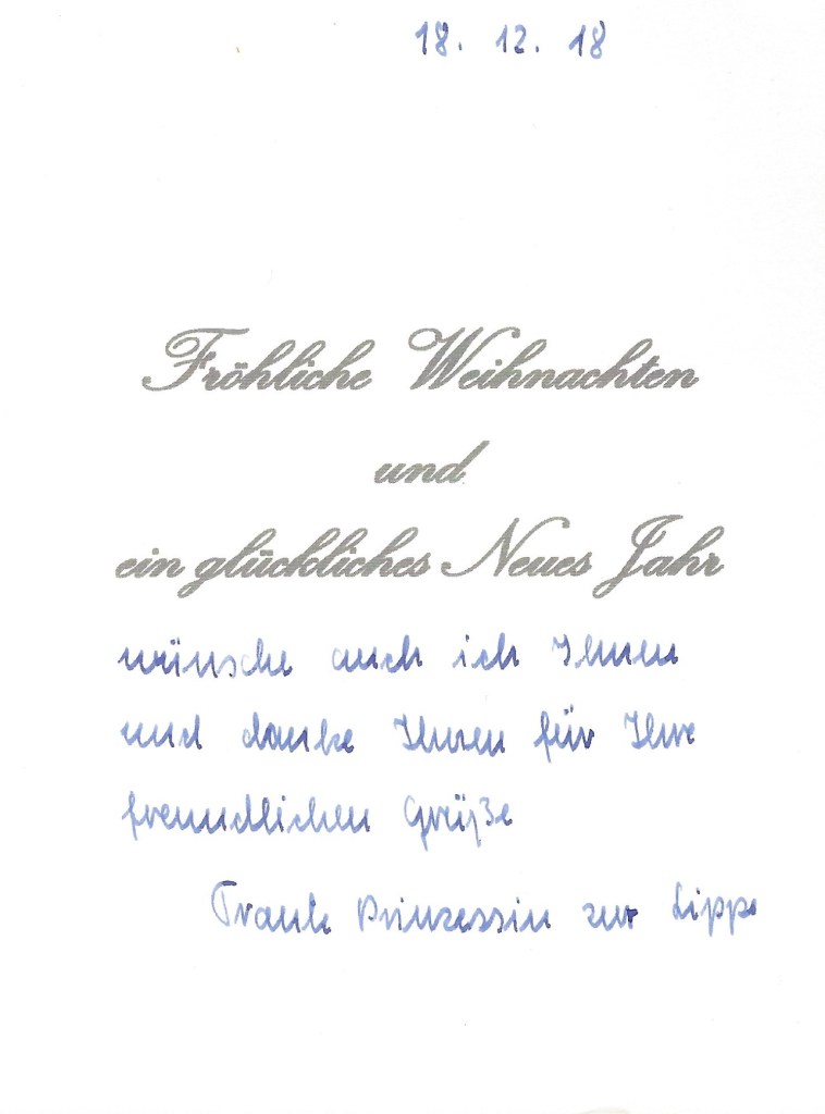 Royal response from Her Serene Highness Traute, The Dowager Princess de Lippe on the occasion of Christmas 2018 and New Year 2019.