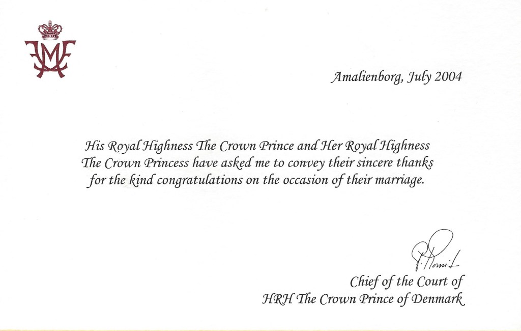 Royal response from Their Royal Highnesses The Crown Prince and Crown Princess of Denmark on the occasion of their wedding.