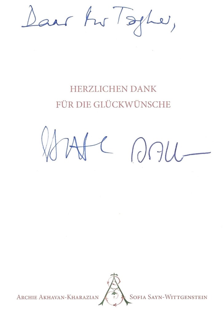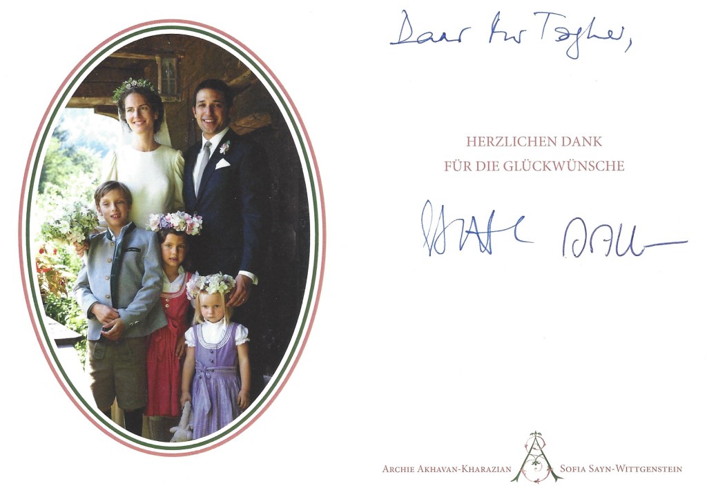 Royal response from Her Serene Highness Princess Sofia of Sayn-Wittgenstein-Sayn and Mr. Archie Akhavan-Kharazian on the occasion of their wedding.