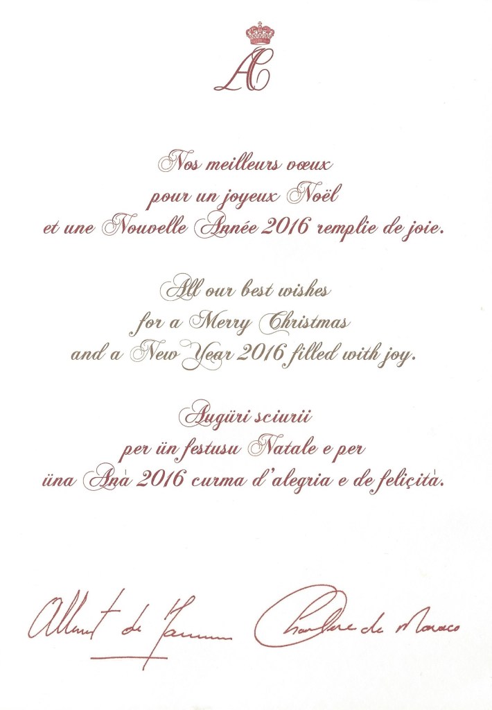 Royal response from Their Serene Highnesses The Prince and Princess of Monaco on the occasion of Christmas 2015 and the New Year 2016.