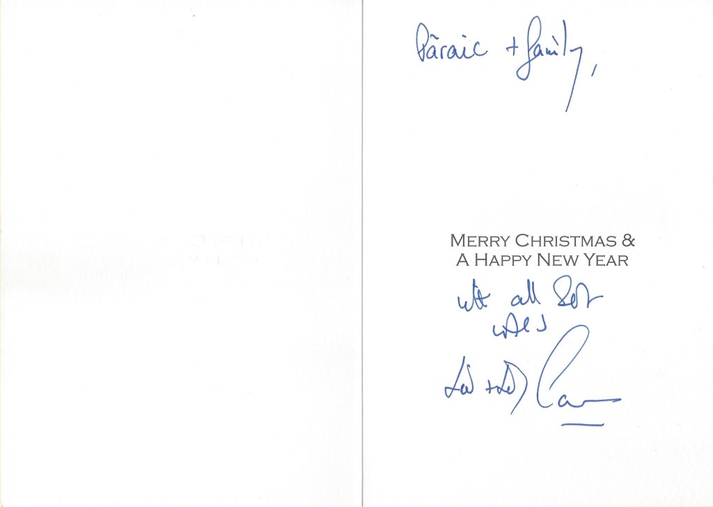 The reply is in the form of a card which on the front is a picture of Highclere Castle surrounded by snow and inside is a printed message wishing me a Merry Christmas and A Happy New Year na dis hand signed by Lord and Lady Carnarvon. Highclere Castle was the setting for the acclaimed period drama Downton Abbey.