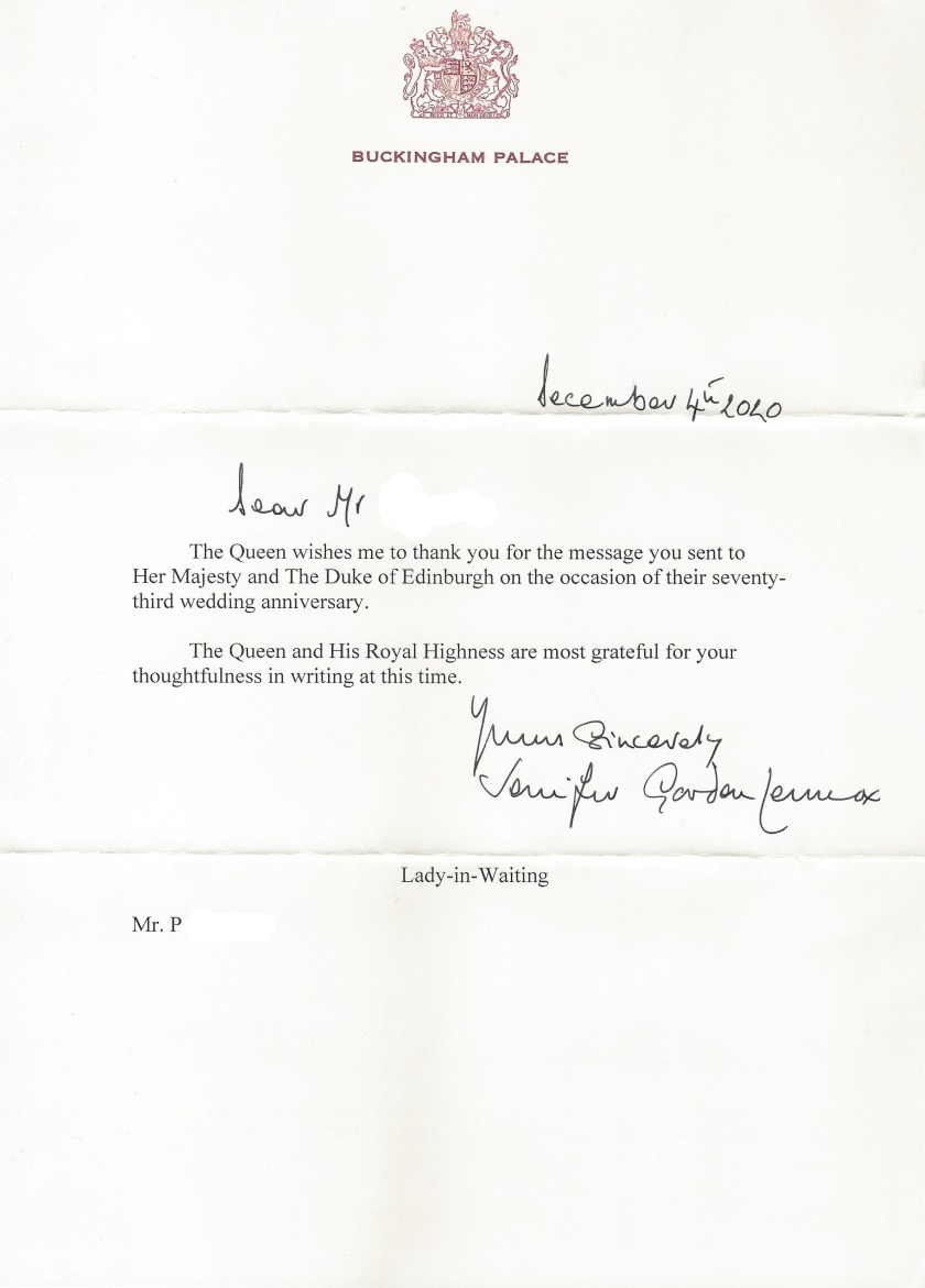 The reply is in the form of a letter thanking me for my anniversary wishes to Her Majesty and His Royal Highness and is signed by one of her Ladies-in-Waiting in this case by Jennifer Gordon-Lennox.