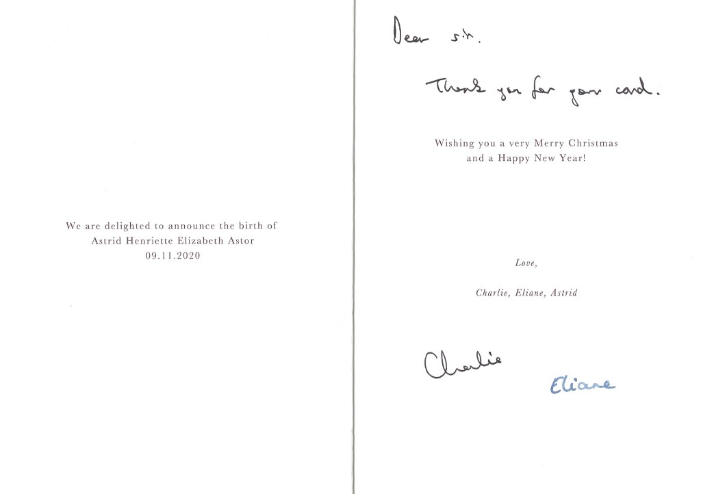 Royal response from The Hon. Charles and Princess Eliane Astor on the occasion of Christmas 2020 and The New Year 2021 and the birth of their daughter Astrid.