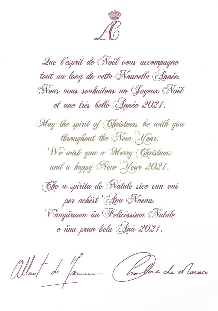 Royal response from Their Serene Highnesses The Prince and Princess of Monaco on the occasion of Christmas 2020 and the New Year 2021.