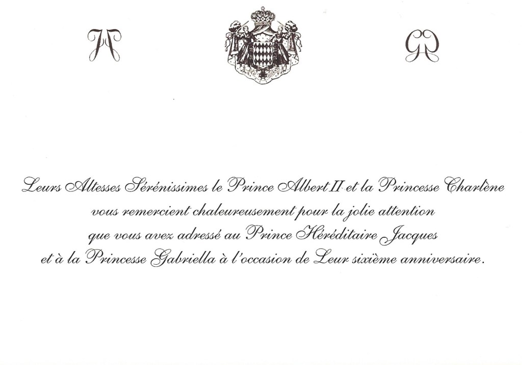 Royal response from Their Serene Highnesses The Prince and Princess of Monaco on the sixth birthday of their children Their Serene Highnesses Jacques, Hereditary Prince of Monaco, Marquis of Baux and Princess Gabriella, Countess of Carladès.