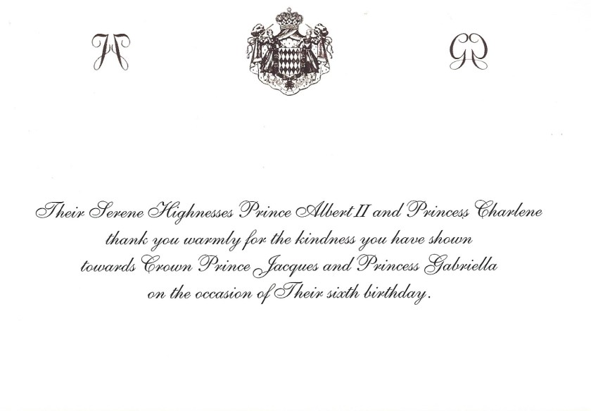 The reply is in the form of a double sided card, pme side been in English and the other in French. On top is is the Crest of The Kingdom of Monaco and The Monograms of Their Serene Highnesses Jacques, Hereditary Prince of Monaco, Marquis of Baux and Princess Gabriella, Countess of Carladès.