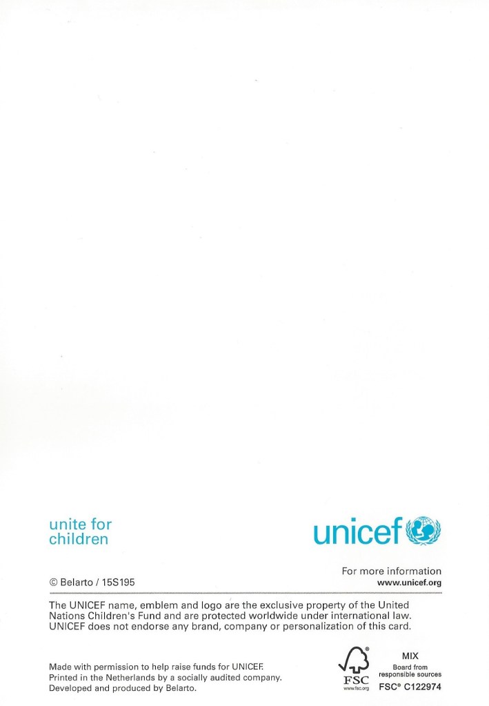 The reply is in the form of a card with a message inside in both English and Dutch. The card is in support of UNICEF.