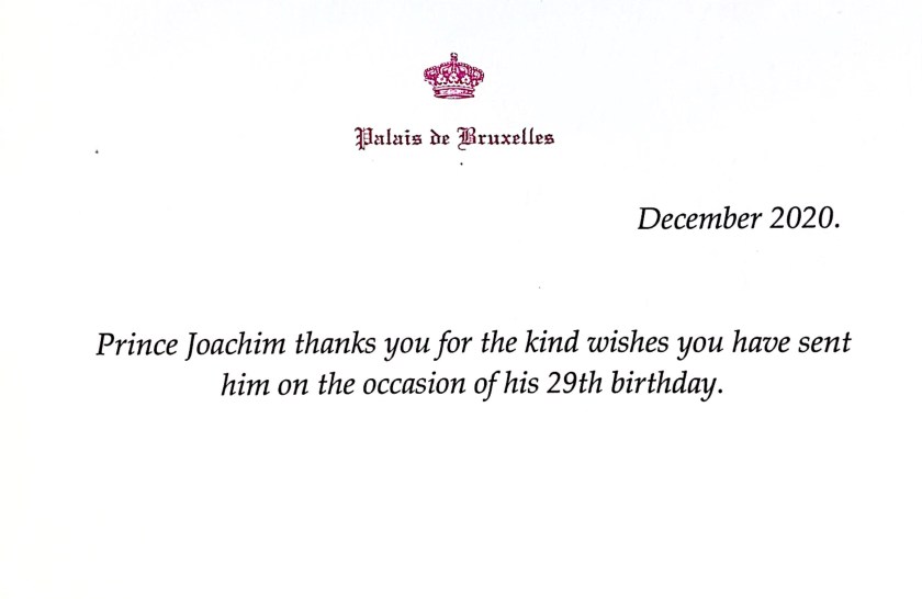 Royal response from His Imperial and Royal Highness Prince Joachim of Belgium, Archduke of Austria-Este on the occasion of his 29th birthday.