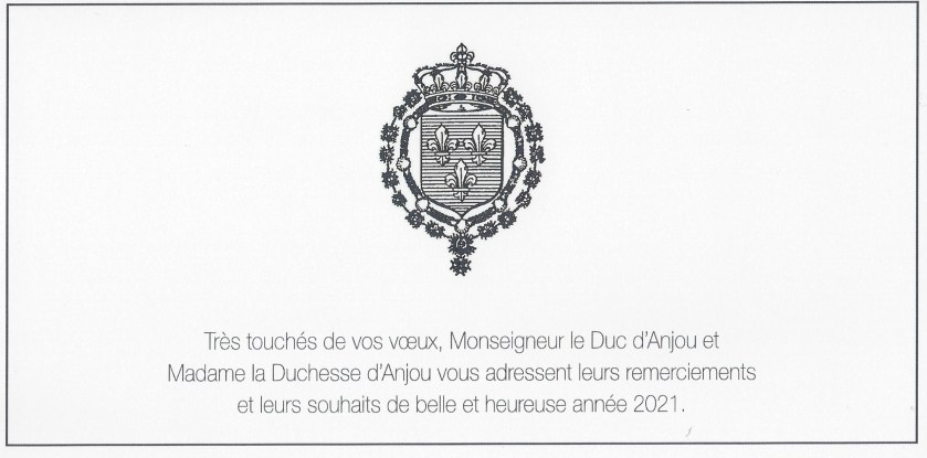 Sincerely yours, Monsignor the Duke of Anjou and Madam the Duchess of Anjou send you their thanks and their wishes for a beautiful and happy new year 2021