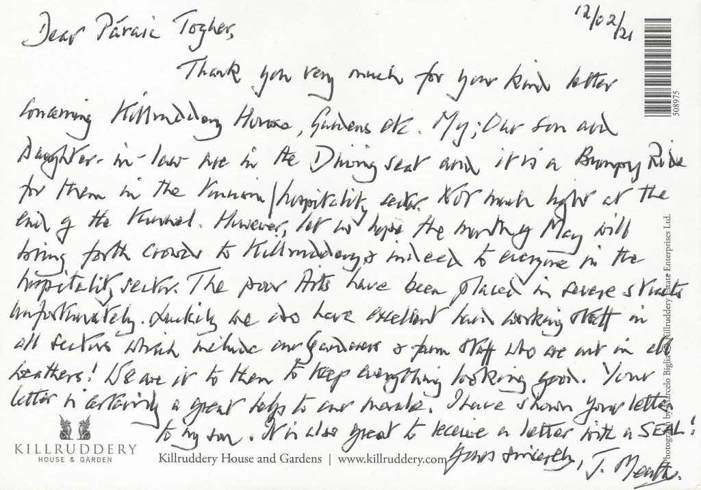 Response from The Right Honourable The 15th Earl of Meath in reply to a letter I sent to the family about Killruddery House.