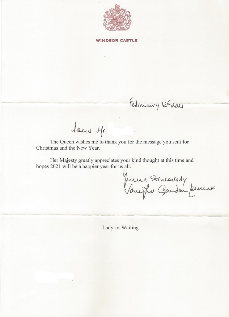 The reply is in the form of a letter thanking me for my Christmas wishes and wishing me the best, the letter was sent from Windsor Castle and signed by one if Her Majesty’s Ladies-in-Waiting, Jennifer Gordon-Lennox.