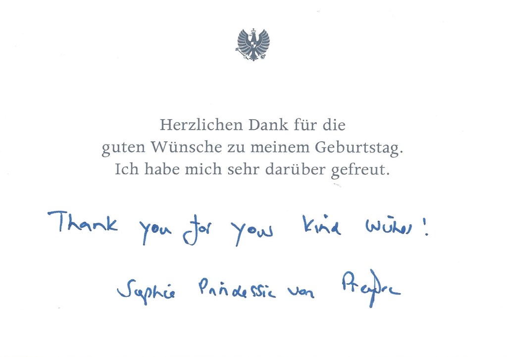 Royal response from Her Imperial and Royal Highness The Princess of Prussia on the occasion of her 43rd Birthday.