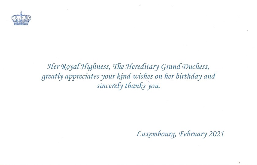 Royal response from Her Royal Highness The Hereditary Grand Duchess of Luxembourg on the occasion of her 37th birthday.