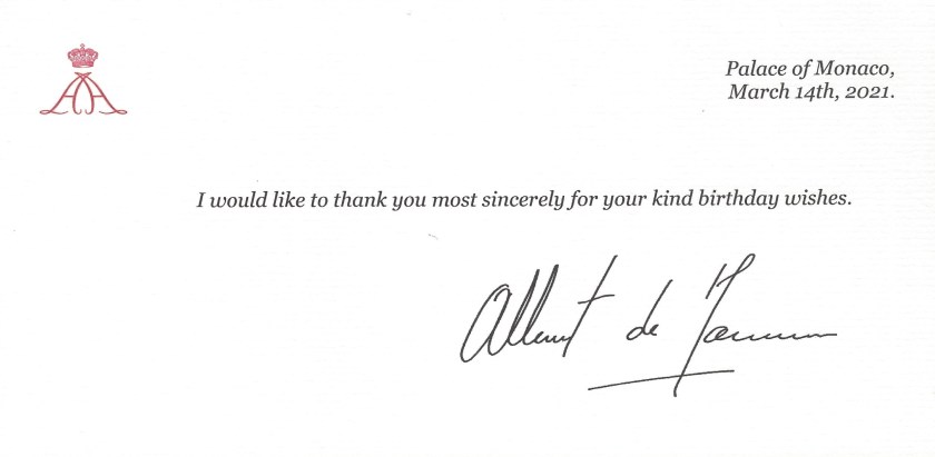 Royal response from His Serene Highness The Prince of Monaco on the occasion of his 63rd birthday.