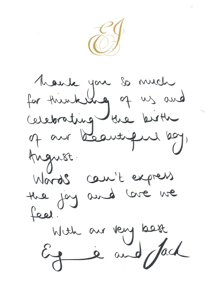 The reply is in the form of a double sided card which on the front features a picture of the couple with their new born son taken by their midwife and released by the couple and on the back is a handwritten message that was printed onto the replies.