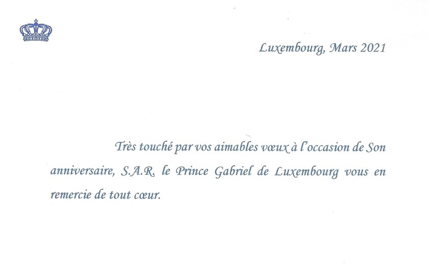 Very touched by your kind wishes on the occasion of His birthday, His Royal Highness Prince Gabriel of Luxembourg thanks you wholeheartedly.