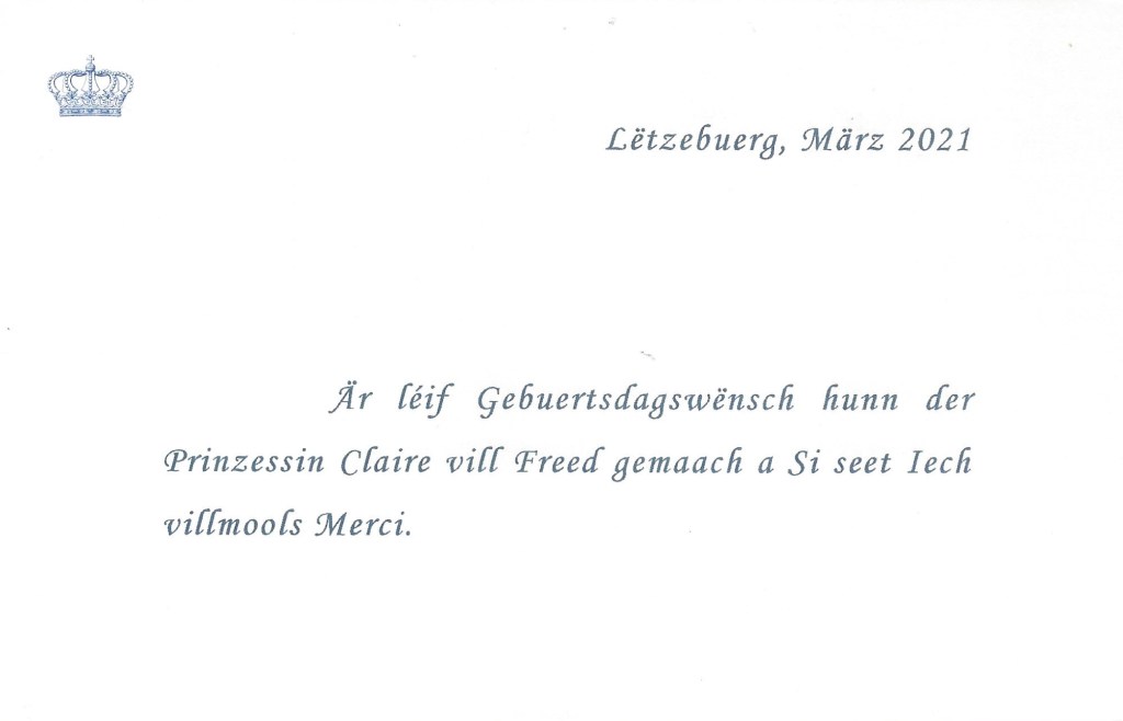 Royal response from Her Royal Highness Princess Claire of Luxembourg on the occasion of her 36th birthday.