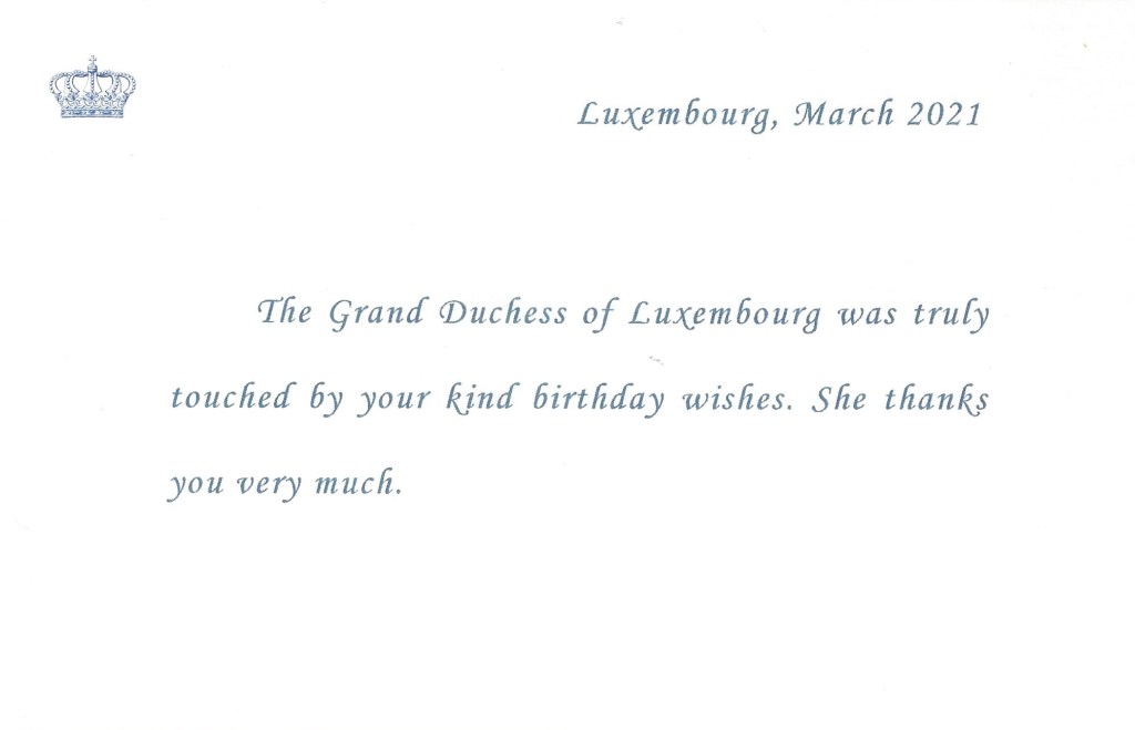 Royal response from Her Royal Highness The Grand Duchess of Luxembourg on the occasion of her 65th birthday.