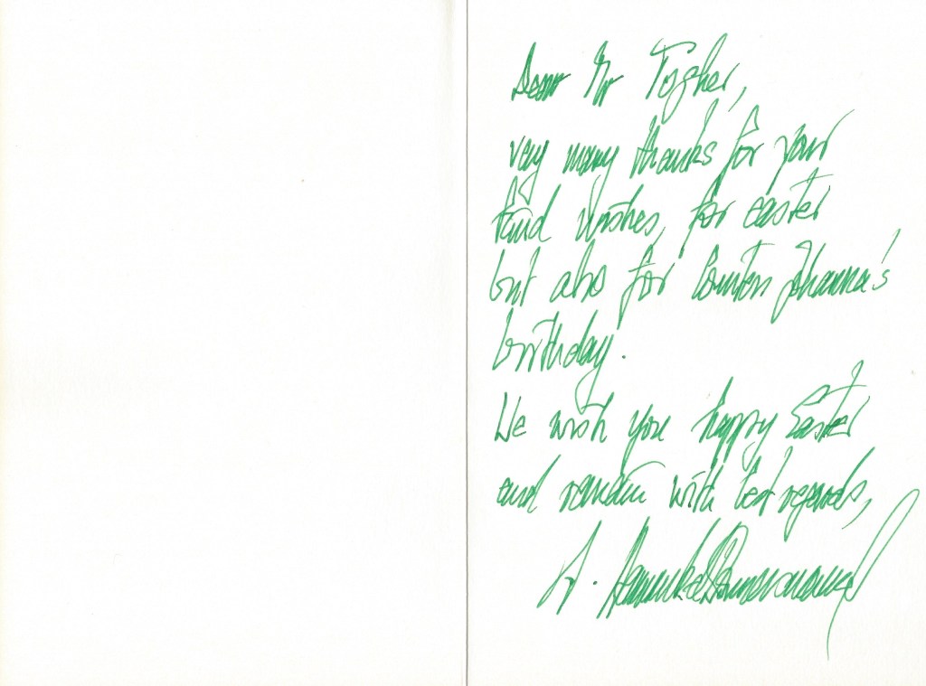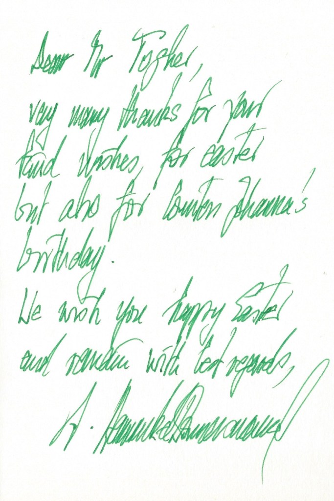 The reply is in the form of a card which on the front has a picture of the couple that was taken on the occasion of their silver wedding anniversary and inside is a message in English thanking me for my Easter and birthday wishes and signed by The Graf.